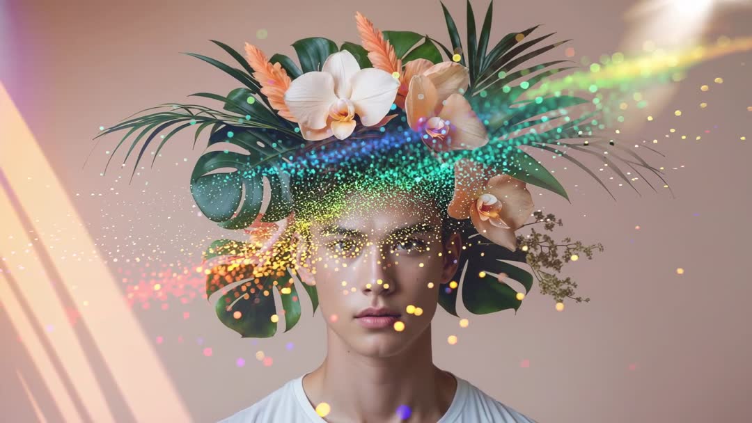 - Surreal Model with Tropical Headdress Melting Reality with Rainbow Particles