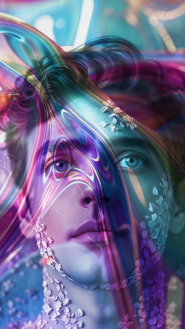 AI Generated Image. Vertical video showing close-up model face partially veiled by translucent swirling rainbow ribbons and scattered floral petals, neon studio lighting creating luminous color gradients and reflective highlights. Mood leaning dreamy, surreal and expressive, minimalist composition allowing focus on eyes and texture. Creative use cases including suiting fashion campaigns, beauty editorials, music video intros, social media reels, app splash screens and gallery projections. Production tips suggesting looping short segment for seamless mobile stories, applying slow-motion for fluid ribbon movement, adding ambient synth or reverb-heavy soundscape, placing branding or headline text in calmer color zones to preserve facial focus. Post-processing advice recommending boosting vibrance, enhancing cyan and magenta midtones, adding soft vignette and preserving highlight detail for glossy ribbon reflections. Output recommendations including exporting vertical 9:16 at 1080x1920 or 4K vertical for high-resolution use and preparing shorter loopable cuts for Instagram and TikTok.