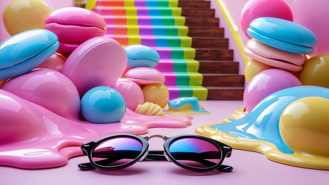 AI Generated Video. Imagery captures sunglasses amid melting discs and vibrant, rainbow staircase. Stylized as minimalist art and employing vibrant pastels alongside a surreal aesthetic. Suitable for creative projects, ads for fashion or art events, blogs about art or personal expression, decor prints exploring whimsy.