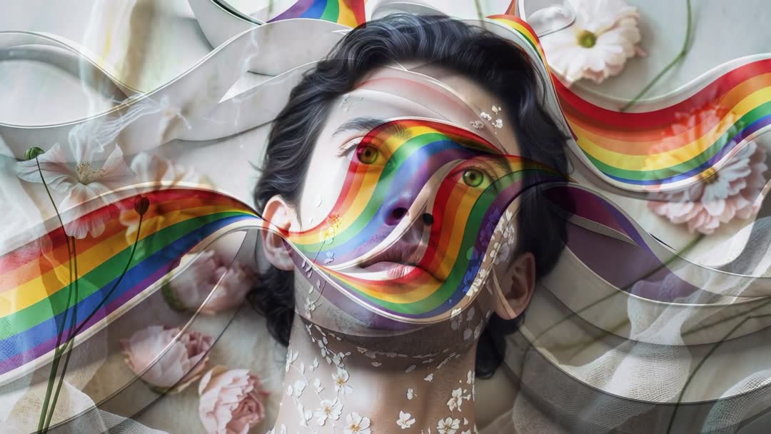 AI Generated Image. This video depicts a serene and surreal scene featuring an Asian man lying on pale fabric, surrounded by rose petals. Rainbow ribbons seamlessly weave across, creating an abstract and dreamy landscape. Ideal for projects related to creativity, tranquility, imagination, or artistic expression. Could enhance a design needing dreamlike, peaceful, or emotive videory with a focus on aesthetics and themes of humanity's connection to the surreal world.