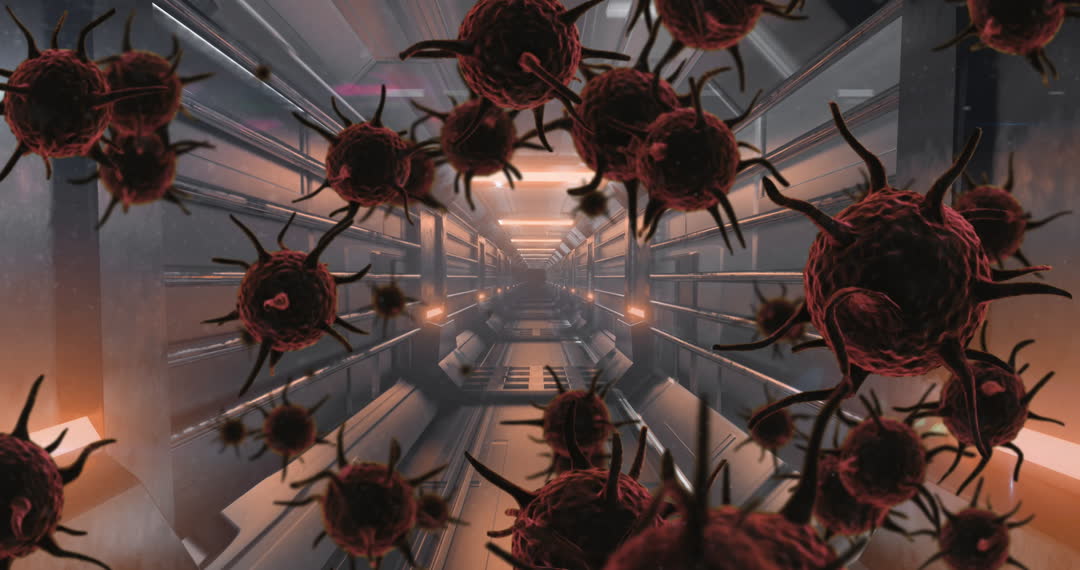 This artistic depiction focuses on dark virus-like structures prominent over an abstract technological corridor. The dim lighting and perspective evoke themes of pandemic, infection risk, and scientific exploration. Ideal for visuals related to health threats, futuristic technology, or depicting abstract challenges in a modern context.