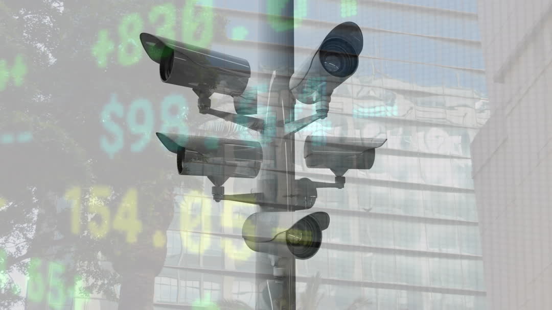 Depiction of surveillance cameras with an overlay of financial data suggests themes of financial security, monitoring, and technology's role in investment. Useful in articles or presentations about corporate security, fintech innovations, or economy oversight.