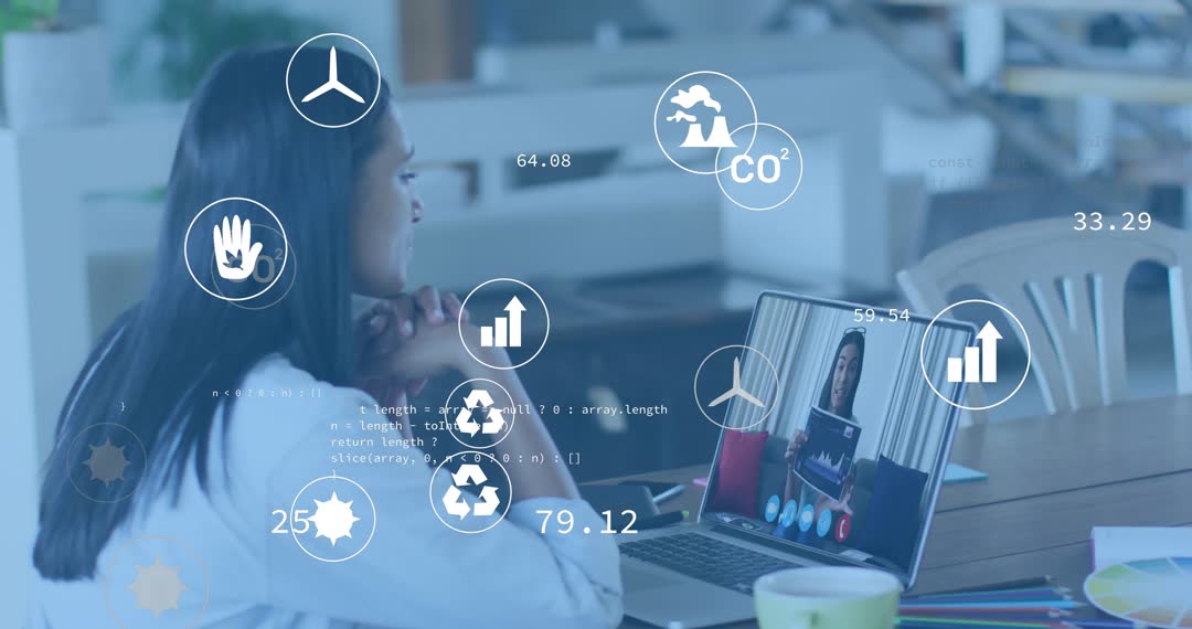 Professional joins virtual meeting on laptop, focusing on environmental data analytics. Sustainability indicators, including carbon emissions and resource efficiency icons, present. Useful for illustrating teamwork in technological and environmental contexts, highlighting collaborative efforts and eco-friendly initiatives in modern workplaces.