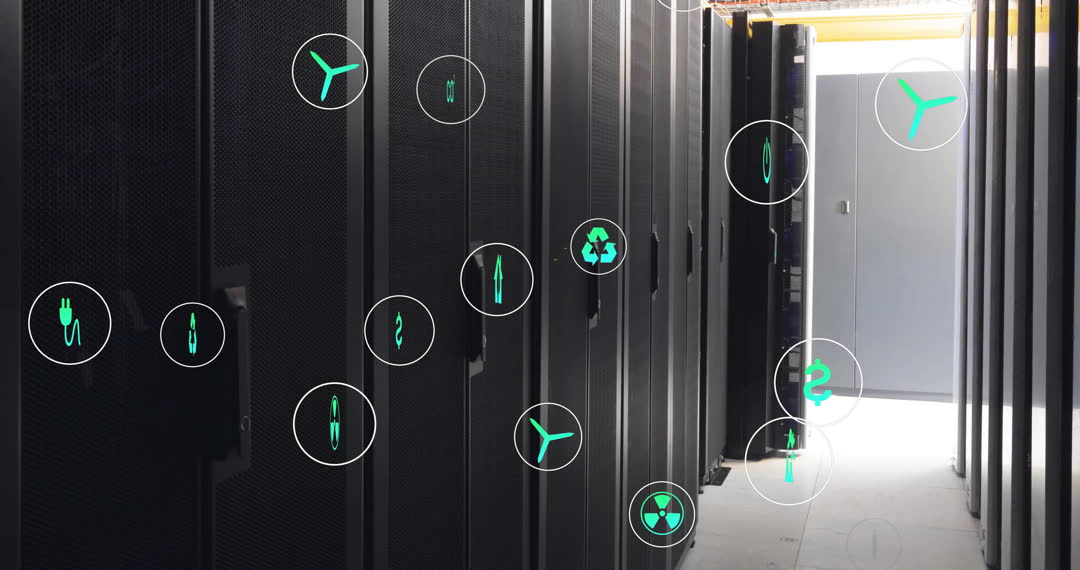 Digital animation of eco-friendly symbols overlay computer servers in a data center, representing green technology and sustainability. Ideal for conveying messages about clean energy, advancements in environmentally friendly tech, and innovative solutions in digital infrastructure. Useful for promotional materials, blog posts, or articles on green technology practices.