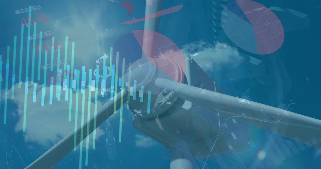 A dynamic depiction of renewable energy integrated with financial data concepts. The visual overlays financial charts and graphs with an video of a wind turbine, symbolizing the connection between sustainability and economic trends. Useful for content about renewable energy investments, sustainable business practices, and the future of energy and finance.