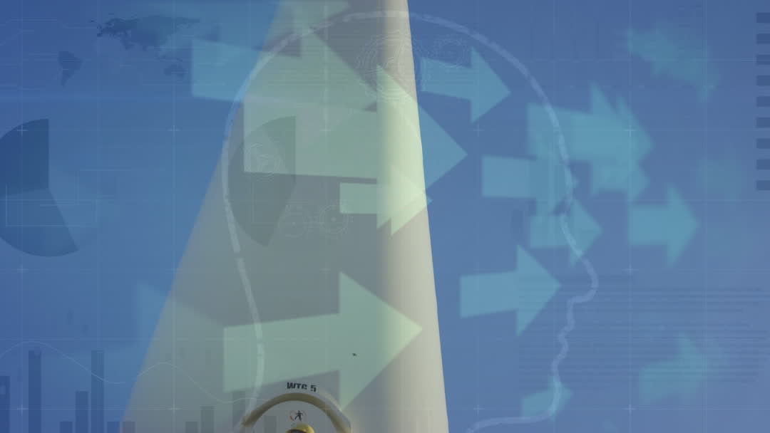 Visual representation of a wind turbine combined with digital graphics such as arrows and graphs conceptually highlighting advancements in renewable energy, innovation, and the intersection of technology with environmental sustainability. Suitable for illustrating topics related to green economy, clean energy initiatives, and technological progress in resource management.