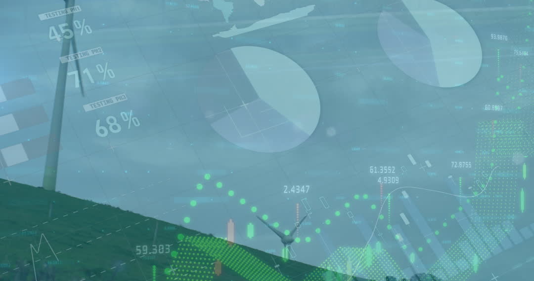 Digital composition illustrating overlap of an analytical interface with windmills on a green hill. Graphs, charts, and data convey concepts of sustainable energy and technological growth. This animation is ideal for use in presentations on renewable energy, environmental solutions, and financial reports discussing sustainability. Also suitable for educational and organizational marketing materials.