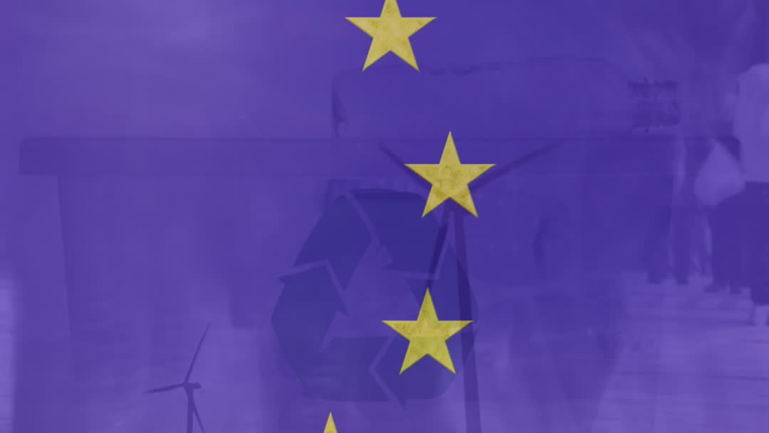 Illustrates European Union's commitment to sustainable energy and environmental technologies. Showcases wind turbines symbolizing renewable energy against abstract backdrop of EU flag with digital elements indicating technological integration in eco-friendly initiatives. Ideal for articles, reports, or presentations on EU's energy policies, environmental strategies, or sustainability initiatives.
