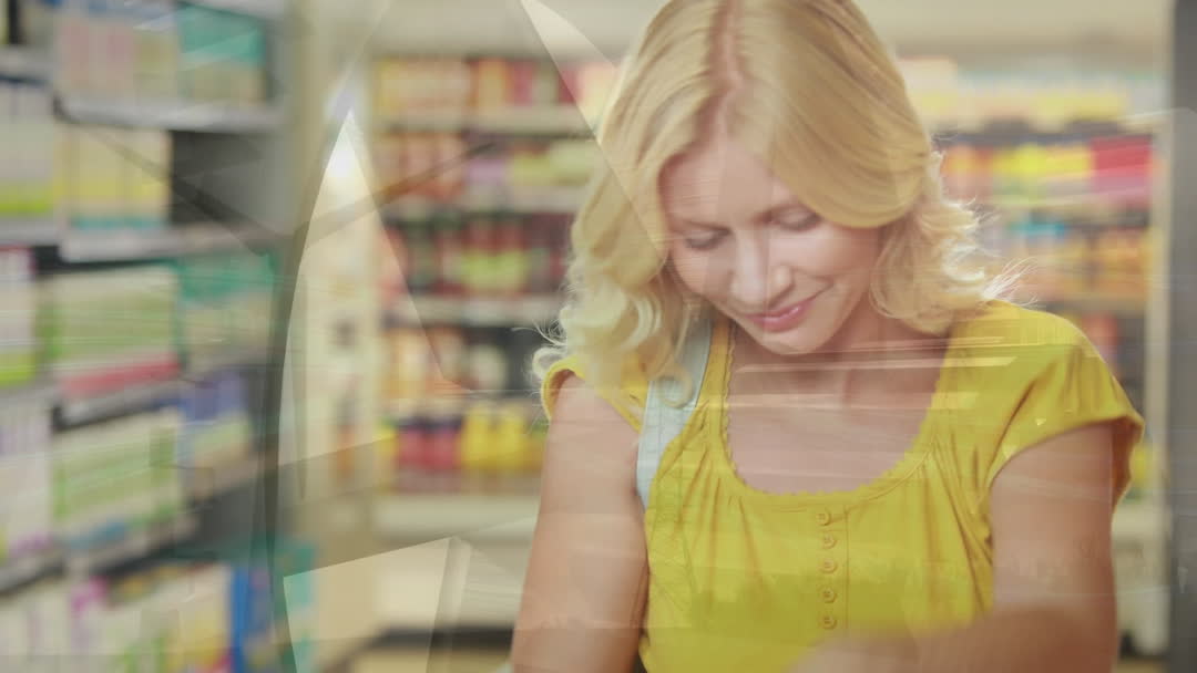 A digital video overlay of animated cogs and a wind turbine silhouette is blended with a scene where a smiling caucasian woman shops in a supermarket. Suggests themes of eco-conscious consumerism and integrates digital interfaces with real-world environments. Useful for illustrating concepts in sustainable retail, future shopping technologies, or environmentally responsible consumption.