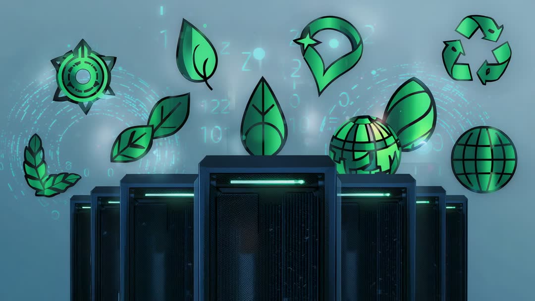 AI Generated Image. In a data center, green holograms hover above sleek black servers, symbolizing sustainability in technology. Rotating numerical patterns and eco-friendly icons emphasize innovation. Useful for presentations on digital transformation, environmentally conscious technology, and data infrastructure modernizations. Ideal for illustrating cutting-edge advancements in green technology and eco-responsible IT solutions.