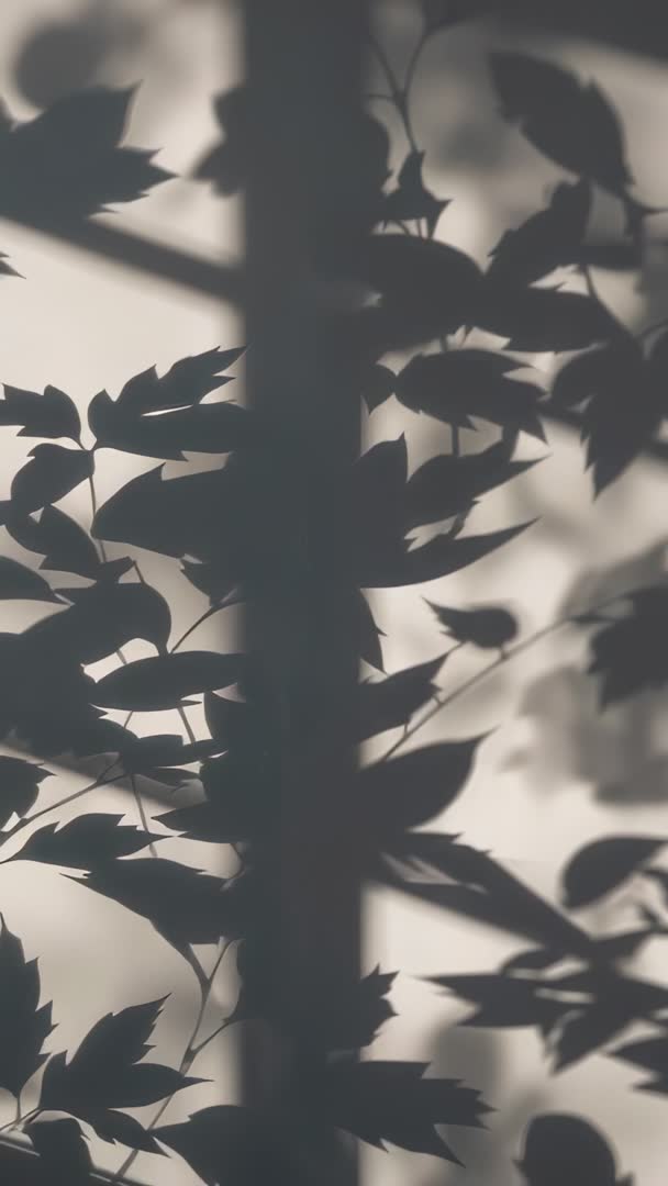 AI Generated Image. Vertical video showing leaves swaying gently across backlit window mullion, casting crisp silhouettes against soft, diffuse light. Monochrome palette creating moody, minimalist atmosphere suitable for calm, contemplative projects. Serving as background loops for meditation apps, social media vertical stories, title sequences, and product showcase overlays. Looping-friendly motion and ample negative space allowing seamless text overlays and lower-third placement. Color grading suggestions: introducing warm tint for cozy mood or cool tint for cinematic drama. Using ambient piano or nature soundscapes for immersive atmosphere. Working well as B-roll for editorial pieces about seasons, urban nature, home interior, and slow living lifestyle.