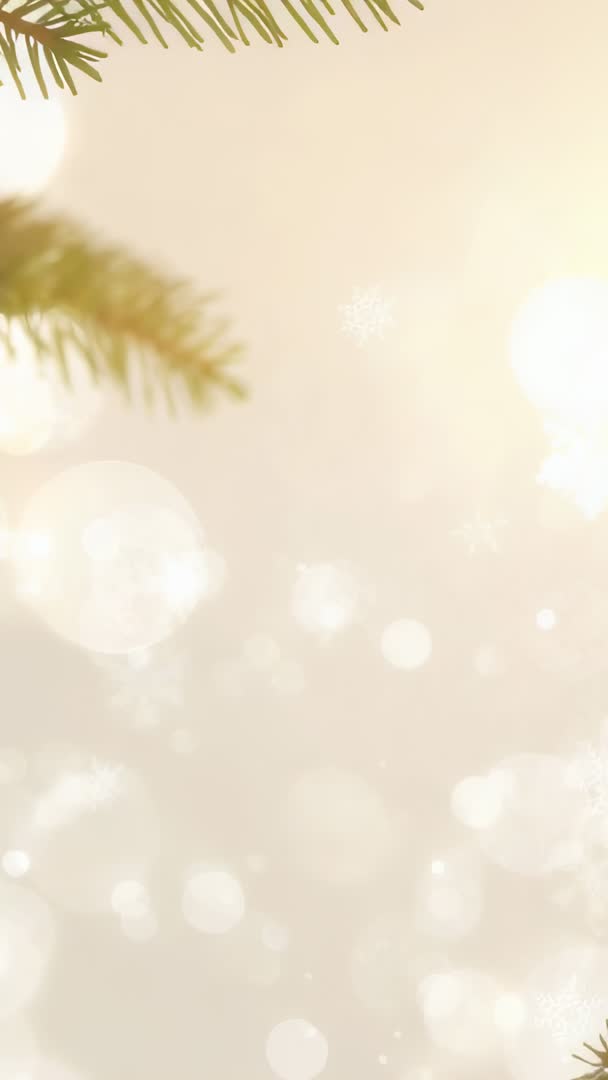 AI Generated Video. Swaying evergreen branch showing gold bauble with warm bokeh and soft snowflakes creating cozy festive mood. Vertical 9:16 frame offering clean negative space for text and graphics on lower two thirds. Loop-friendly motion permitting seamless background for social media stories, mobile ads, and greeting video cards. Color palette featuring warm gold and cream tones blending with soft green needles. Perfect for holiday promotions, seasonal branding, e-greeting templates, store window displays, and event invitation intros. Technical notes: studio-lit close-up with shallow depth of field and soft focus bokeh, high-resolution original suitable for cropping and color grading.