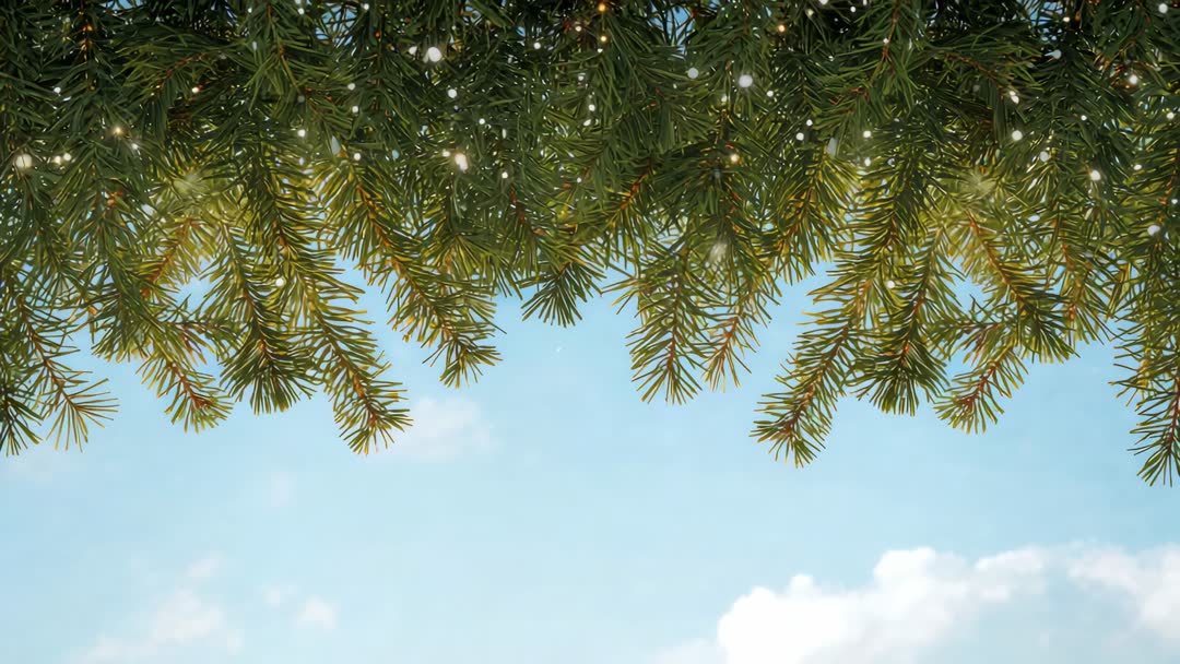 AI Generated Video. Swaying fir branches framing clear blue sky, clouds drifting across horizon, tiny light specks floating downward. Sunlit needles creating soft contrast with sky while offering generous negative space at lower frame for text or graphics. Suitable for seasonal greeting cards, holiday marketing, website header, social media banner, meditation or relaxation videos, nature documentaries, environmental campaigns, and product hero backgrounds. Loop-friendly motion and calm pacing supporting slow-motion edits and cinematic B-roll sequences. Color palette highlighting evergreen greens and sky blues, making footage easy to color-match with branding and overlaying white or dark text. Use as backdrop for quotes, event announcements, desktop wallpaper, streaming intros, or seasonal transitions.