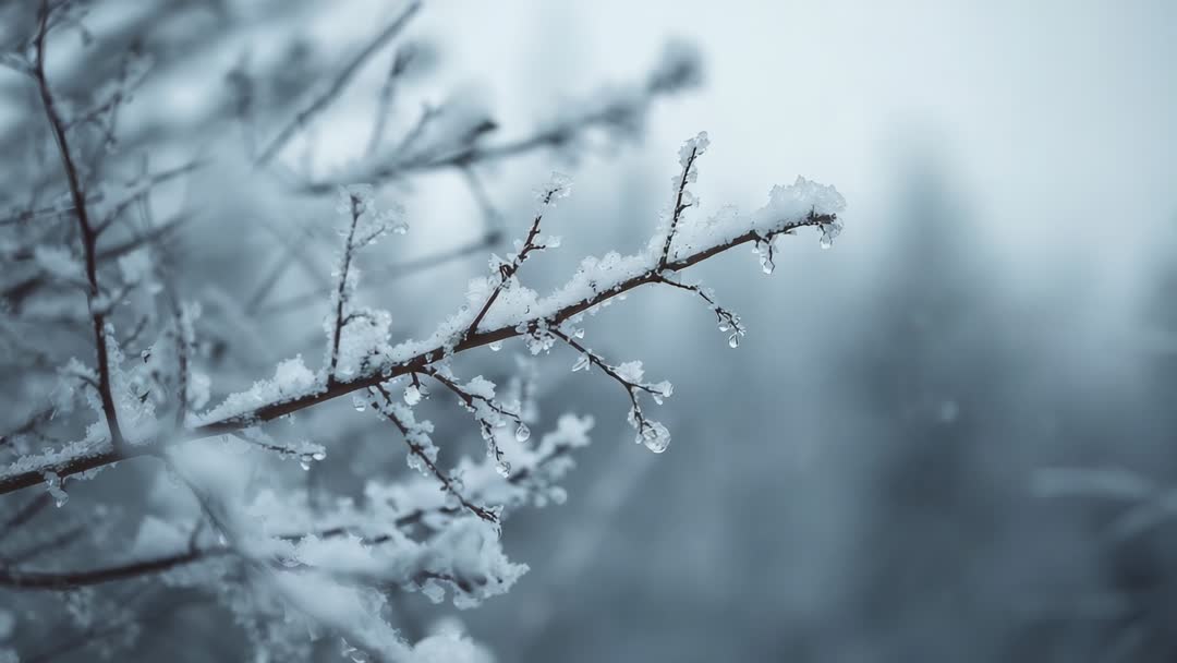 AI Generated Video. Showing thin twig coated in crystalline frost and hanging ice droplets, gently swaying in faint breeze with subtle camera motion. Close-up macro video highlighting melting ice, dripping water beads, delicate texture of bark, and shallow depth of field with cool blue tonal palette. Conveying quiet, tranquil, reflective winter mood ideal for calming or atmospheric scenes. Useful for seasonal commercials, winter travel promos, nature documentaries, meditation and wellness apps, website hero loops, social media reels, and environmental messaging. Suggested treatments: slow motion playback, soft ambient soundscape, cool color grading to enhance blue tones, and overlaying minimal text for title cards; clip working well as loopable background or transitional cutaway in longer edits.
