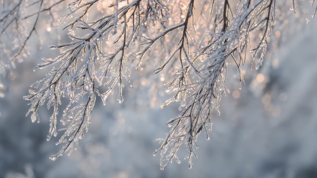 AI Generated Video. Swaying frosted branches reflecting warm golden hour light, delicate ice droplets glistening and forming slow drips. Shallow depth of field creating soft pastel bokeh and subtle light flares while thin twigs bend in gentle breeze. Closeup macro motion highlighting fragile texture of ice coatings and tiny water beads, offering calm and meditative visual flow. Ideal uses include background loop for seasonal websites, winter product commercials, social media reels, holiday greeting videos, nature documentary transitions, meditation or relaxation clips, screensavers, digital signage, and broadcast lower thirds. Suggested edits include subtle color grade toward cooler tones or enhanced warm highlights, slow motion playback for dramatic detail, gentle speed ramping, and addition of ambient piano or natural sound for mood. Footage characteristics: macro focus, backlit illumination, soft focus background, high frame rate suitable for slow motion and looping.