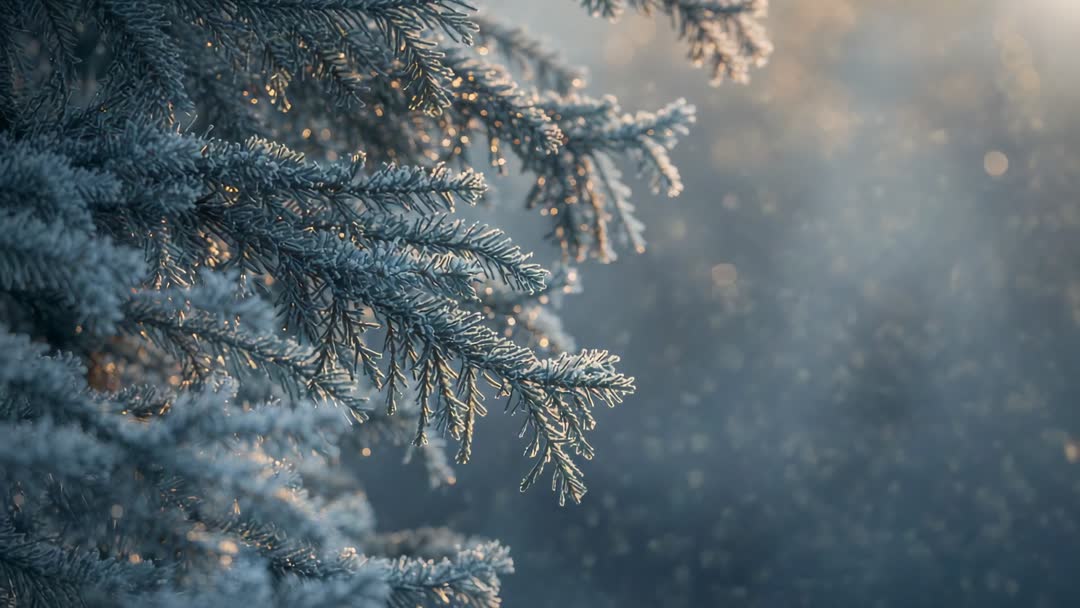 AI Generated Video. Showing close-up of frosted fir branches swaying in gentle breeze while delicate snowflakes drifting and sunbeams warming needles. Featuring hoarfrost and sparkling frost crystals creating soft bokeh background with cool blue tones and warm golden highlights. Serving winter holiday marketing, seasonal greeting animations, nature documentary intros, background footage for relaxation apps, website hero banners, product packaging, social media stories, environmental awareness campaigns and editorial winter landscapes. Featuring shallow depth of field and slow-motion friendly frame rate for smooth playback, seamless looping and easy text or logo overlay. Evoking calm, peaceful morning mood and crisp cold atmosphere suitable for storytelling and seasonal branding.