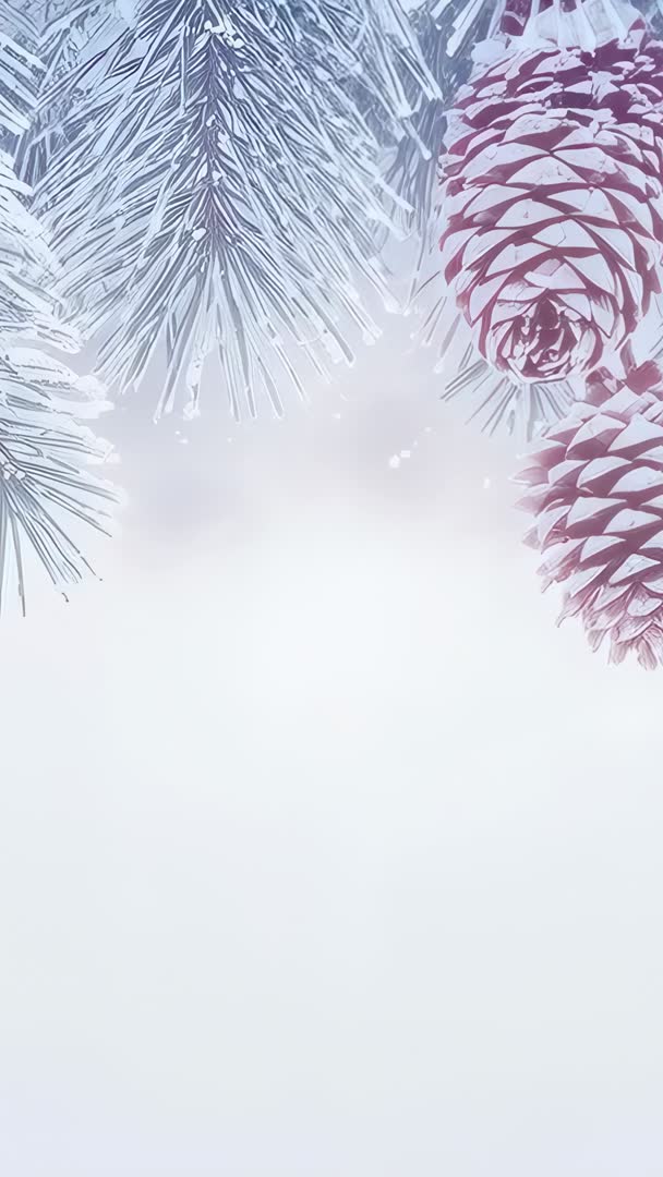 AI Generated Video. Vertical 9:16 video showing frosty pine limbs gently swaying under light breeze with two cones hanging at right edge and soft snow drifting. Shallow depth of field and delicate bokeh creating airy pale background with abundant negative space in center and lower third for text or graphics. Clip working well as seasonal background for social media reels, Instagram stories, TikTok, mobile wallpapers, holiday greetings, product ads, website hero sections, mood videos, and event invitations. Suggested edits include slow motion looping, subtle color warmth for holiday mood, light vignette, overlaying falling snow or particle elements, and adding ambient piano or wind sounds. Plenty of room for vertical text and logo placement centered or in lower third while preserving natural motion.