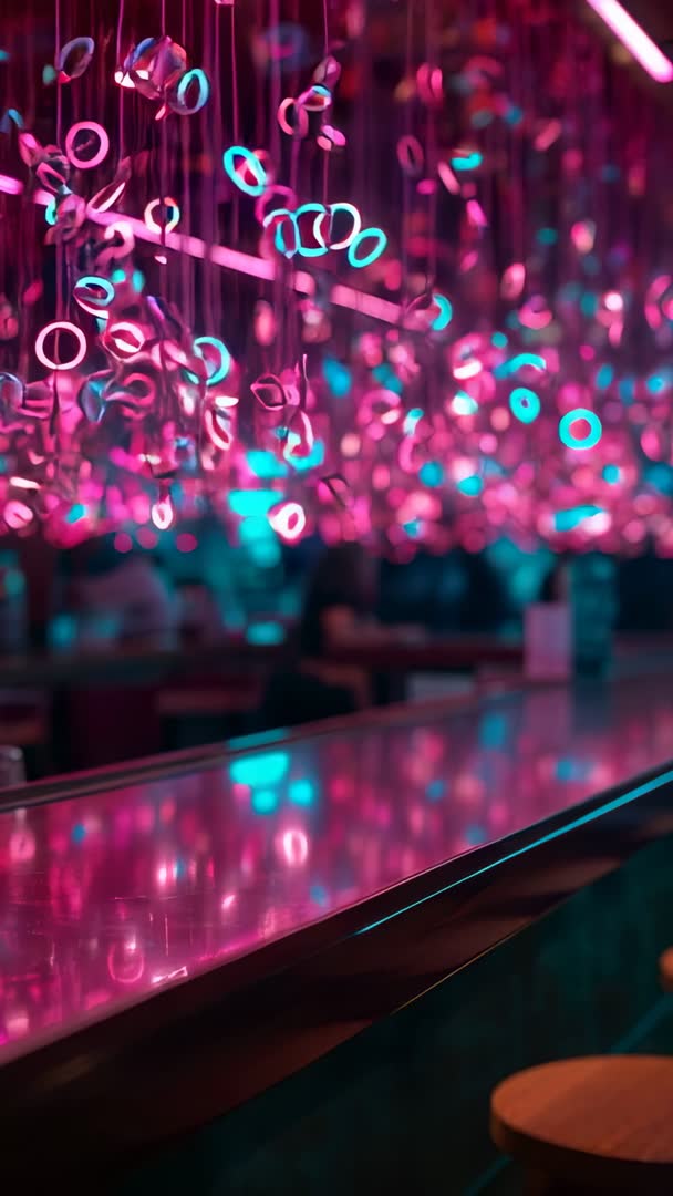 AI Generated Video. Vertical footage showing swaying neon ring pendant lights responding to gentle breeze above glossy bar counter, creating shimmering pink and cyan reflections across polished surface. Foreground featuring reflective counter leading to blurred lounge background and dreamy bokeh, delivering shallow depth of field and fluid motion. Strong color contrast and rhythmic movement creating modern, cinematic mood suitable for nightlife and hospitality visuals. Ideal for vertical social video ads, Instagram Reels, TikTok backgrounds, bar or club promotion, cocktail menu intros, music visual loops, mood-setting brand clips, interior design reels, and event promo trailers. Clip working well with color grading, speed ramping, and loop edits to extend ambient atmosphere.