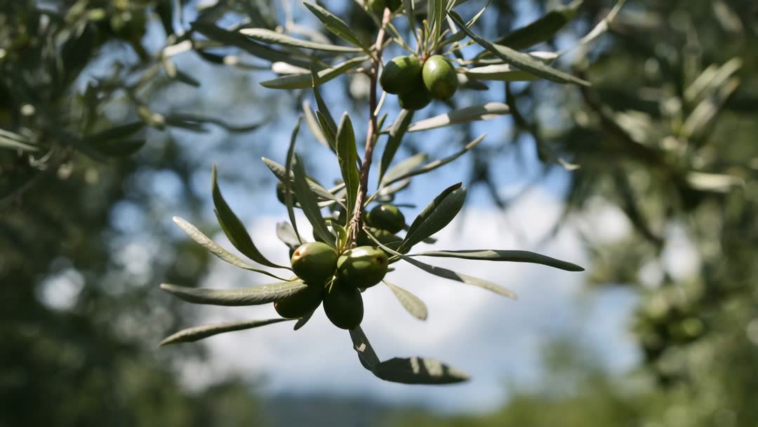 AI Generated Image. Close-up video clip capturing swaying olive branch with glossy green olives against soft blue sky and blurred foliage. Camera centering on fruit cluster, keeping olives sharp while leaves and background gently blur. Natural sunlight highlighting texture and subtle shadows on fruit skin. Gentle breeze producing rhythmic motion, creating calming organic movement and subtle ambient sound for atmospheric B-roll. Usage suggestions: - Use for culinary branding, olive oil packaging, and product commercials seeking authentic Mediterranean feel. - Use as hero footage for farm-to-table websites, recipe videos, and agricultural documentaries. - Loop for background video on landing pages, social media stories, or in-store display screens. - Pair with text overlay or lower third during documentary sequences or promotional ads. - Edit into slow-motion sequences or color-graded promos to emphasize texture and color. Technical notes: - Shot as tight close-up with shallow depth of field and pronounced bokeh, ideal for selective focus applications. - Natural light, steady framing, and gentle motion providing clean plate for compositing, color grading, or looping.