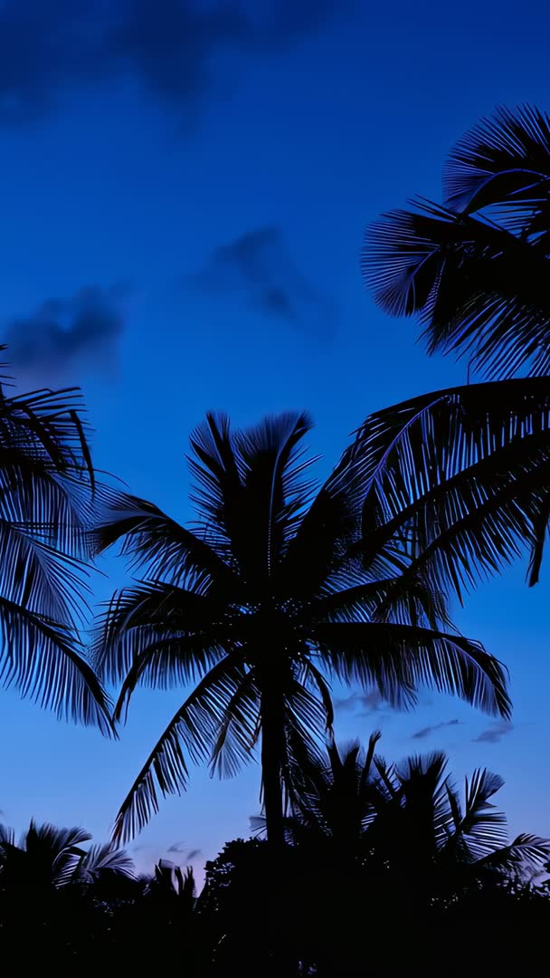 AI Generated Video. Vertical video showing swaying coconut palm silhouette against deep blue twilight sky. Fronds moving gently in light breeze while wispy clouds drifting along horizon, creating calm tropical mood. Tall vertical frame working perfectly for mobile content, social media Reels, Stories, and TikTok. Use as opening shot for resort promotion, travel vlog intro, or ambient relaxation loop. Layer text overlay for event promotion, holiday campaign, or inspirational quote cards. Ideal background for meditation app, screensaver, or website hero banner. Color palette featuring deep blues and soft purples supporting night time storytelling and branding for travel, hospitality, and wellness projects. Clip also useful for cinematic transitions, title sequences, or slow-motion study of natural movement. Provide calming looped footage option for spa marketing, digital signage, or in-store ambiance.
