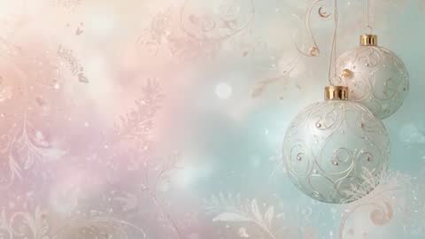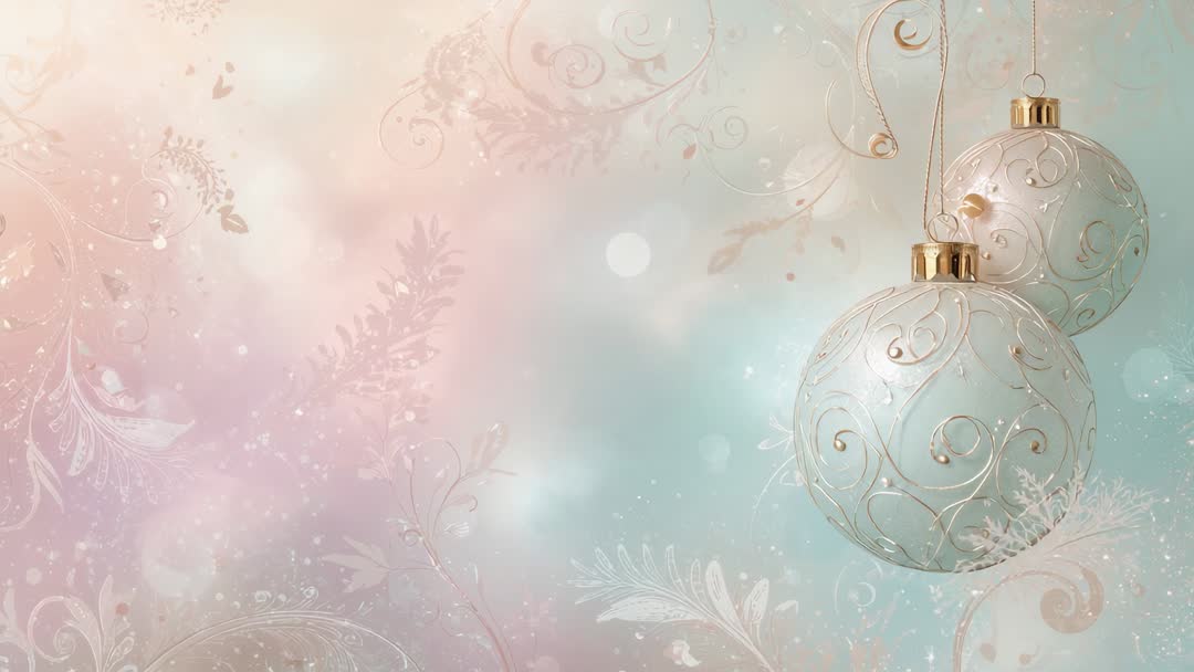 AI Generated Video. Soft pastel gradient backdrop featuring two hanging baubles decorated with filigree and gold caps, gently swaying in slow motion. Delicate swirl motifs and subtle bokeh lights creating dreamy, elegant mood. Left-side ample copy space allowing text overlay, logo placement or lower-third graphics. Clip working well for holiday greeting video, online ad, social media story, website hero banner, e-card animation, retail window loop or wedding holiday montage. Color palette of pale pink, mint and gold supporting luxury and calm seasonal branding. Recommending looped playback for continuous background use, adding soft instrumental music and light particle overlay for extra atmosphere. Providing 4K export and alpha channel for easier compositing and title integration.