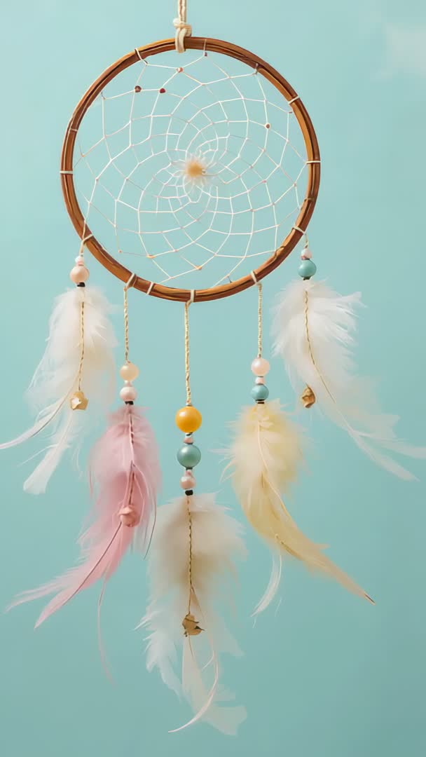 AI Generated Image. Clip showing pastel dreamcatcher gently swaying against soft mint background. Handmade hoop featuring woven web, wooden beads, delicate pink, yellow, and white feathers moving on thin gold cords. Cinematic vertical footage capturing slow motion sway and subtle lighting, conveying calm boho charm and feminine serenity. Serving lifestyle videos, wellness and mindfulness content, social media reels, Instagram stories, product listings, home decor promotions, interior design mood reels, craft and DIY tutorials. Working well as looping background for short-form vertical content, ideal duration 6-15 seconds, or acting as longer ambient clip for meditation and relaxation videos. Suggested edits: adding ambient music, gentle wind sound effects, inspirational quote overlays, branded lower-third. Color palette matching: mint, blush, pastel yellow, warm wood tones. Fitting marketing for handmade goods, bohemian home decor, spa and wellness brands, and editorial features.