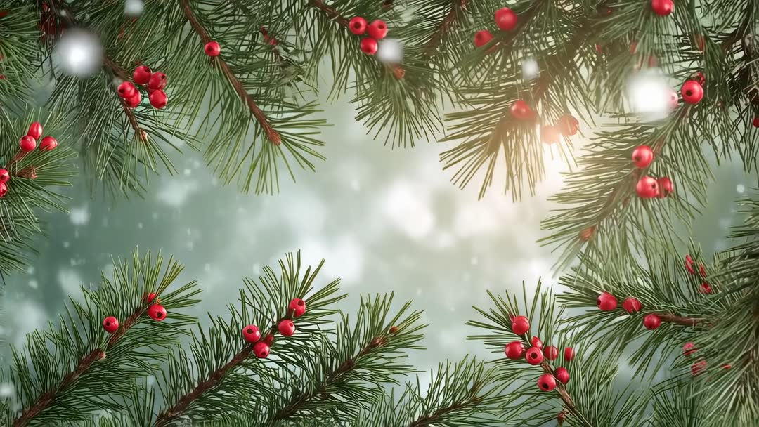 AI Generated Video. Close-up view showing pine branches swaying in gentle breeze while clusters of red berries shimmer and snowflakes falling, sun flare creating warm rim light and soft bokeh. Video offering wide negative space in center for title, logo, or product placement. Scene evoking cozy, festive, peaceful mood ideal for seasonal marketing and holiday content. Use for holiday greeting loops, website headers, social media posts, store signage, product showcases, or animated cards. Try slow-motion playback and subtle color warm-up to enhance warm glow, or add text overlay in center using high-contrast fonts. Provide loopable clip for extended backgrounds, intro/outro sequences, or livestream and virtual event backdrops.