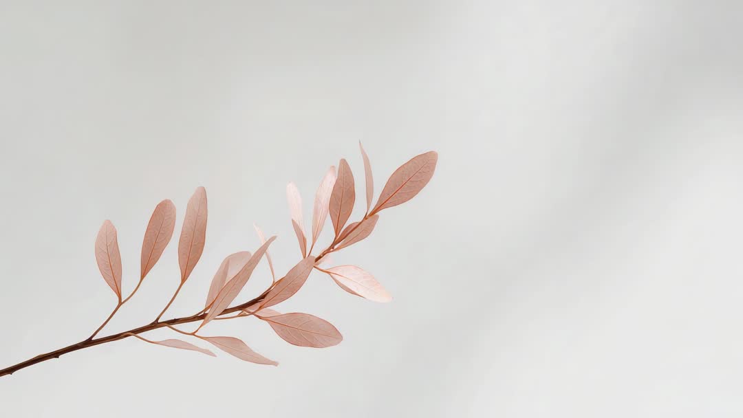 AI Generated Image. Single slender branch with pink leaves gently swaying across soft pale background, catching subtle highlights from diffused light. Minimal composition emphasizing negative space and pastel tones, suitable for looping as seamless clip. Neutral palette blending warm blush and ivory tones, supporting overlaying text or logos. Use ideas: website hero banners, social media reels, product background for cosmetics or wellness brands, meditation and mindfulness app backgrounds, opening shots for lifestyle videos, email headers, printed stationery motion elements, wedding invitation motion loops. Visual features slow calm motion, shallow depth of field, clean studio look, and even lighting, allowing easy color grading, cropping, and compositing for branded content.