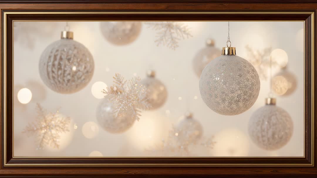 AI Generated Video. Featuring swaying silver baubles and glittering snowflakes floating in warm bokeh and soft focus. Looping motion creating calm festive rhythm for use as background or decorative accent in video projects. Framed by rich wooden border adding vintage elegance and visual depth to composition. Neutral champagne palette and subtle golden highlights supporting upscale seasonal branding. Seamless loop and shallow depth of field enabling smooth playback on websites, social feeds, retail screens, and broadcast spots. Providing negative space for overlay text or logo in center-left area. Ideal uses: holiday landing pages, social media reels, email headers, video intros, e-greeting cards, in-store displays, product ads, event openers. Compatible with motion graphics workflows and easily color graded for brand requirements. Includes realistic metallic textures and crystalline glitter for premium festive mood.