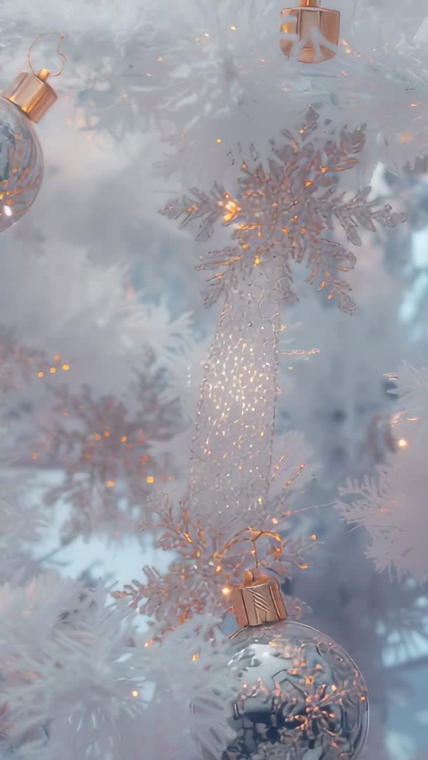 AI Generated Image. Vertical 9:16 clip showing swaying snowflake ornament and reflective glass bauble hanging from white Christmas tree, glowing with warm amber fairy lights. Close-up framing and shallow depth of field creating soft bokeh and shimmering highlights across delicate branches. Featuring gentle breeze motion and subtle camera parallax for calming, elegant movement. Working well for social media stories, Instagram reels, TikTok content, seasonal website headers, greeting card animations, and in-store digital displays. Perfect for overlaying short festive text, logo animations, product promotions, or running as seamless background loop during luxury holiday campaigns. Editing tips: recommend looping clip for continuous playback, applying warm color grade to enhance amber tones, adding soft instrumental music or light crackling fireplace audio for atmosphere. Deliverable suggestions: short 6–20 second loops, slow-motion version for cinematic feel, and crop-safe margins for text or branding overlays.