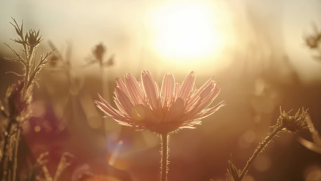 AI Generated Video. Showing single wildflower backlit by low sun, gently swaying in breeze with warm lens flare and creamy bokeh. Providing cinematic close-up footage ideal for nature documentaries, wellness videos, meditation backgrounds, social media storytelling, and product commercials. Capturing soft warm tones and delicate petal texture for use in seasonal campaigns, greeting cards, website hero banners, desktop backgrounds, and calming video loops. Working well as atmospheric B-roll for travel films, environmental messaging, floral branding, and slow-motion montages. Delivering high-resolution visual with natural movement and shallow depth of field for creative editing, color grading, overlay transitions, and loopable scenic backdrops.