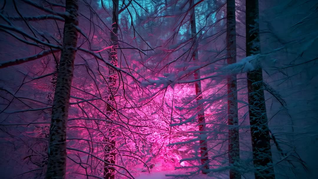 AI Generated Image. Camera sweeping through snow-laden pine stand, revealing intense magenta backlight and soft cyan haze. Branches carrying fresh snow, catching neon glow and forming delicate silhouetted patterns against vibrantly colored background. Slow cinematic motion offering tranquil yet otherworldly mood, suitable for opener, title sequence, music video intro, fashion film, atmospheric commercial, social media short, or VJ visuals. Clip supporting seamless loop across midframes for ambient background use; vertical crop working well for reels and stories. Suggested post-processing: deepening shadows, enhancing magenta tint, adding subtle film grain, applying gentle vignette for cinematic focus.