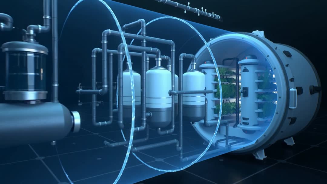 AI Generated Image. Camera sweeping through transparent cylindrical hydroponic module, revealing vertical grow towers, circulating water streams, and networked piping with valves and filters. Cool blue lighting creating futuristic lab atmosphere while plants on towers are growing lush green. Animation demonstrating closed-loop nutrient flow, filtration stages, and modular system connectivity. Useful for explaining hydroponic technology, controlled environment agriculture, urban farming innovation, and sustainable food production. Recommended uses: explainer videos for startups, investor pitch decks, product demos for agtech equipment, trade show displays, website hero loops, social media clips, educational content for schools and universities. Editable for branding with overlay text, voiceover, and data visualizations. Runtime loop-friendly and scalable for high-resolution projects.