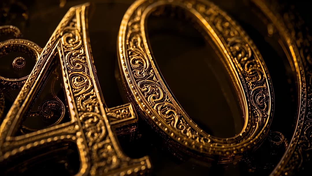 AI Generated Image. Close-up cinematic video showing ornate gold numeral 40 with detailed filigree and embossed scrollwork, accentuating intricate engraving and textured edges against reflective dark base. Panning across digits, revealing depth, highlights, and fine metalwork with warm, sweeping lighting. Suited for anniversary opener, milestone celebration clip, luxury brand reveal, birthday tribute, corporate event title, or elegant title sequence. Providing loopable short clip suitable for 4K timelines, slow-motion playback, and tight crops for lower thirds or overlays. Pairing well with minimal orchestral music, serif typography, and dark matte color grade to emphasize metallic warmth. Useful for web hero banners, invitation motion, social media reels, promotional spots, product launch intros, or countdown sequences.