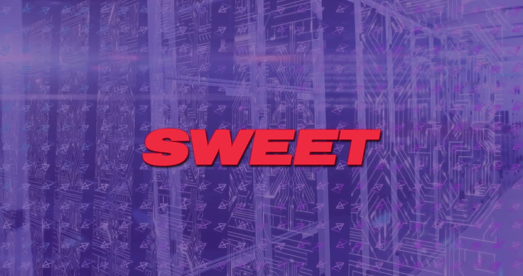 Red text reading 'SWEET' against backdrop of server room grid and circuit pattern providing a futuristic and artistic tech vibe. Useful for technology presentations, digital communications marketing, or creative design projects with a modern digital theme.