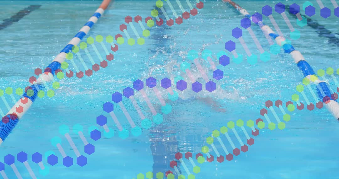 This footage shows a swimmer executing a butterfly stroke while a futuristic DNA helix graphic floats in the frame, suggesting a blend of sport and biotechnology. It is ideal for use in content related to athletic training, biomechanical analysis, sports innovation, or genetic advancements in sports.