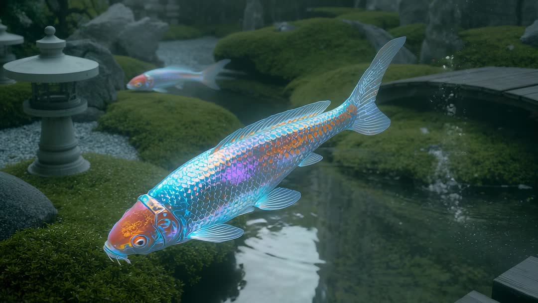 AI Generated Image. This video depicts a luminescent koi fish swimming elegantly in a peaceful pond within a traditional Japanese garden setting. The surroundings include elements like a stone lantern and moss-covered rocks, contributing to the tranquil and minimalist atmosphere. This imagery could be used in content related to relaxation, garden design inspiration, traditional Japanese culture, or meditative visuals perfect for screensavers or calming ambient backdrops.