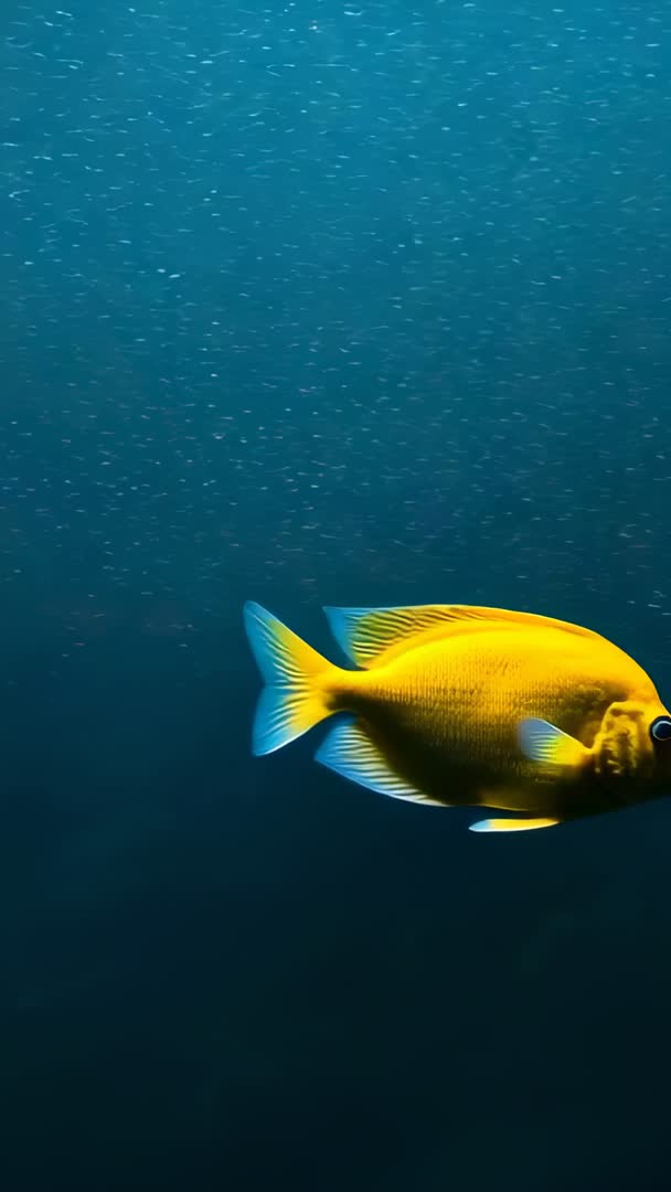 AI Generated Video. Showing vertical video of solitary yellow tropical fish swimming left to right through deep blue water with soft bubbles and suspended particles. Featuring generous left-side copy space for overlaying text, logos, and product mockups tailored for mobile screens. Working well for Instagram Stories, TikTok, Reels, Snapchat, vertical ads, and mobile app intros. Serving as calming background for meditation apps, waiting room displays, aquarium promotions, travel and tourism campaigns, and environmental awareness content. Providing easy loop potential by matching start and end frames for seamless playback. Recommending placement of branding or call-to-action on left-side copy space while keeping fish motion on right for visual balance. Suggesting subtle color grade boost to teal tones and yellow saturation for strong subject contrast.