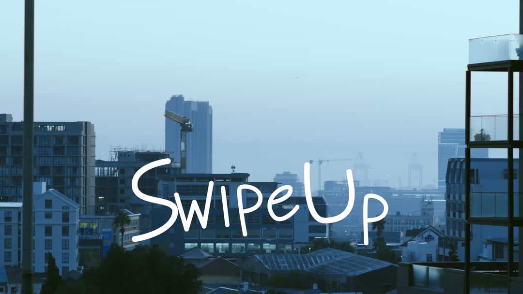 This animation features the text 'Swipe Up' against an urban cityscape background, making it ideal for use in social media networking tutorials, business presentations, or promotional videos that highlight connection and interaction in a modern city environment.