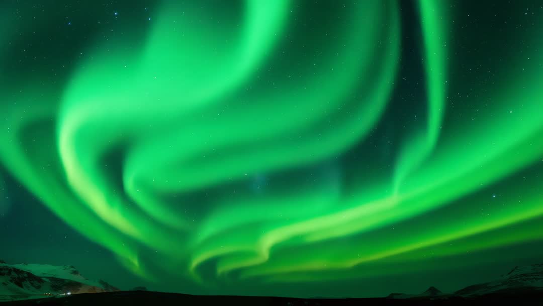 - Swirling Emerald Aurora Vortex Over Snowy Ridge Night Sky Timelapse Footage
