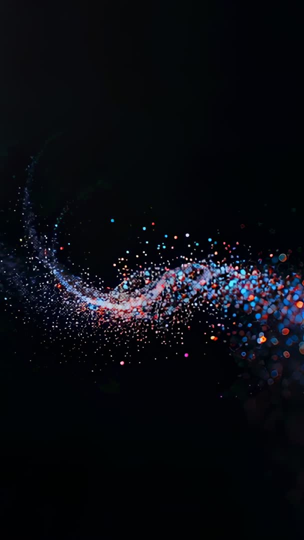 AI Generated Image. Featuring swirling neon particles forming ribbon moving across dark void, producing soft bokeh halo and layered depth. Offering high-contrast vertical composition with smooth motion and glowing color transitions in blue, red, orange tones. Providing loop-friendly timeline with negative space for overlaying text, logos, lower-third graphics. Suiting music video intros, social media stories, app splash screens, livestream backgrounds, product launch teasers, VJ visuals. Delivering cinematic energy and futuristic vibe for tech, science, entertainment, holiday campaigns. Supporting high resolution export, slow-motion playback, and color grading.