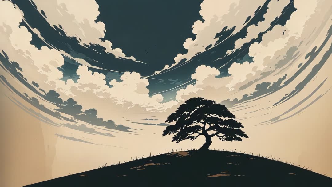 AI Generated Image. This illustrated scene depicts a solitary tree silhouetted against a dramatic swirl of clouds on a gentle, grassy hill, exuding an atmospheric and serene vibe. This video can be used in projects highlighting nature's beauty or as a calming visual in relaxation or mindfulness content.