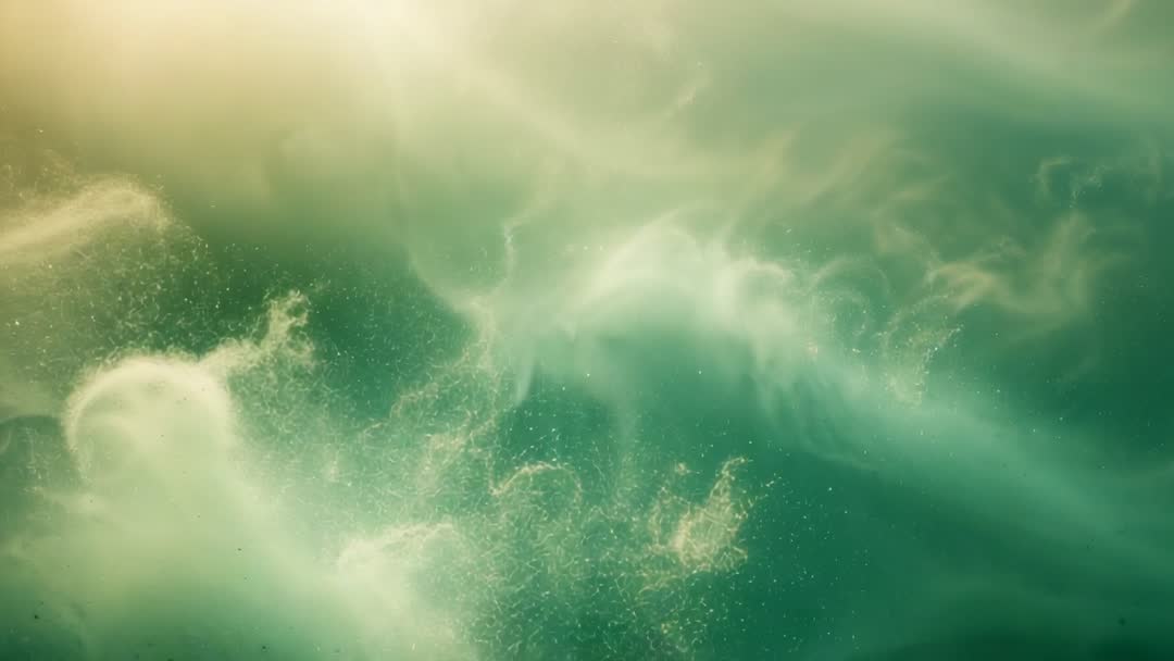 AI Generated Video. Slow-motion video showing swirling teal plume glowing under warm upper-left light, sending fine particle spray and forming delicate eddies. Volumetric fluid dynamics and soft gradients creating nebula-like abstract motion and deep atmospheric depth. Turquoise palette with warm highlights creating calming yet mysterious mood. Suited for cinematic title sequences, music video backgrounds, sci-fi openers, tech branding, wellness and meditation content, website hero banners, motion graphics overlays, social media posts, album covers, and advertising campaigns. Works well as loopable background and for slow-motion playback on large-format displays. Fine particle detail supporting close-up crops and abstract visual storytelling. AI-generated aesthetic enhancing futuristic or experimental projects.