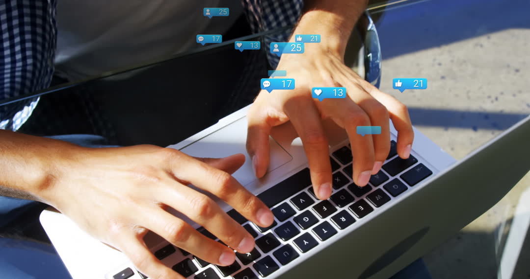 Person engaged using laptop, highlighting digital communication network with social media notifications illustrated as floating graphics. Suitability for themes on digital navigation, online presence, tech lifestyles, trending interactions and dynamic networking strategies, helpful for illustrating tech updates or interactive tutorials.