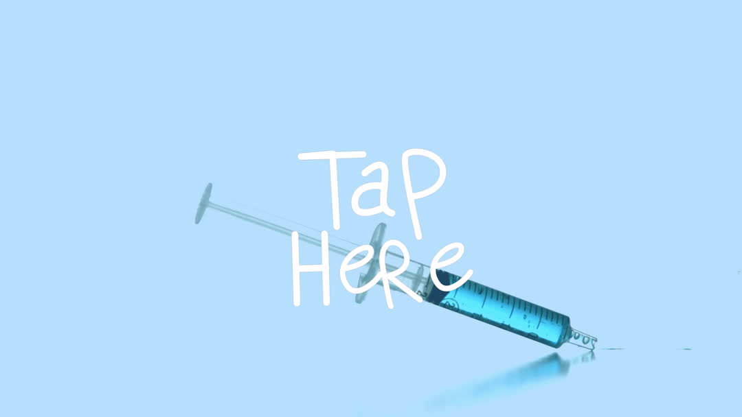 This stock photo showcases a syringe filled with a blue reagent against a light blue background, embellished with playful 'Tap Here' text. Ideal for use in digital communications, healthcare websites, science animation demos, or educational materials related to chemistry and medical tech.