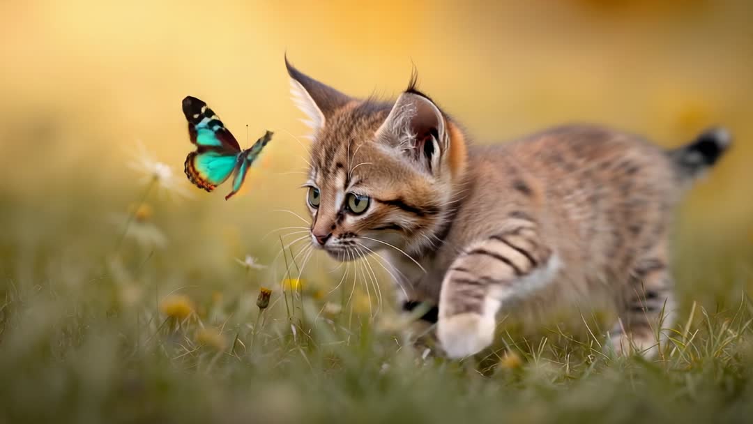 AI Generated Image. Video showing tabby kitten stalking turquoise butterfly across sunlit meadow during golden hour. Close-up low-angle shot emphasizing whiskers, focused eyes, raised paw ready to pounce. Background featuring soft bokeh wildflowers and warm golden tones creating tranquil, playful mood. Working well for children's programming, pet care tutorials, nature and wildlife segments, social media reels, website hero banners, greeting cards, advertising campaigns. Clip working well for storytelling about curiosity, first outdoor adventures, kitten playtime, seasonal spring and summer promotions, and brand campaigns seeking cute, heartwarming visuals.