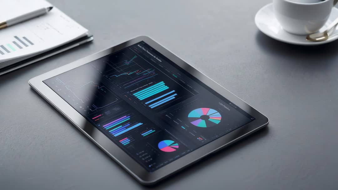 - Tablet Analytics Dashboard Under Shifting Light Glare on Office Desk for Data Visuals