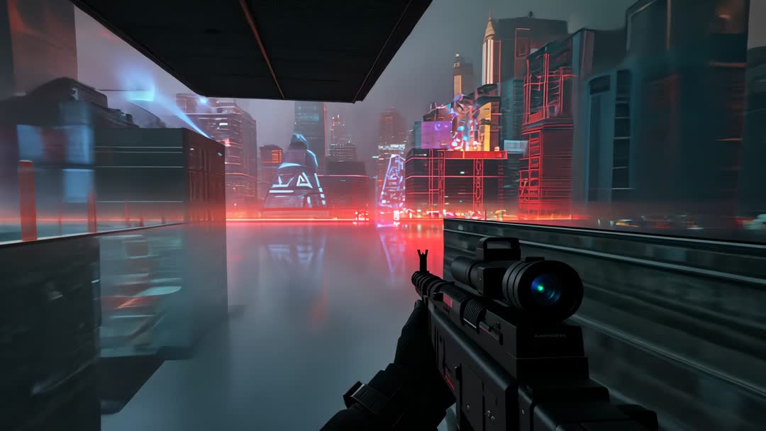 AI Generated Image. A scene showing player advancing in a compelling cyberpunk cityscape complete with neon lights and reflective surfaces. The setting conveys an intense, high-stakes atmosphere as the player raises a scoped rifle. Suitable for depicting themes of urban adventure, tactical engagements, gaming, or conceptual art in new technological landscapes. Great for design inspirations, game development visuals, or multimedia projects that underline the collision between advanced technology and dystopian aesthetics.