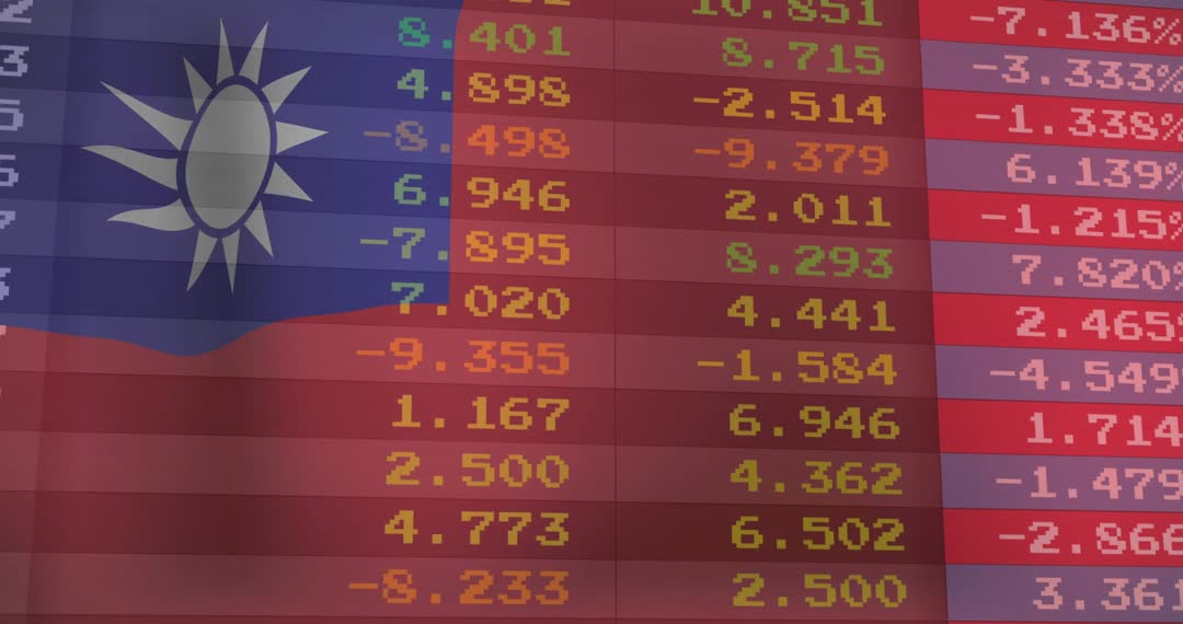 Red and green numbers of stock prices alongside Taiwanese flag suggest focus on economic trends in Taiwan. Useful for articles about investment opportunities or financial trends in Asia, charts and infographics on Taiwan's economy, or discussions on stock market fluctuations.