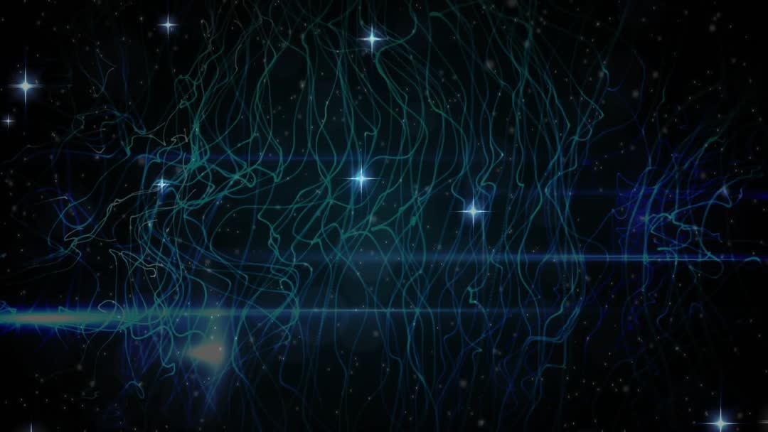 This video frame presents vibrant neon-green filaments pulsing and undulating synthetically across a cosmic plane, evoking a sense of futuristic energy transmission in digital art. Perfect for illustrating concepts of cutting-edge technology, energy, and fluidic light motion, suitable for backgrounds in sci-fi projects, futuristic designs, and digital animations that require a high-tech aesthetic.